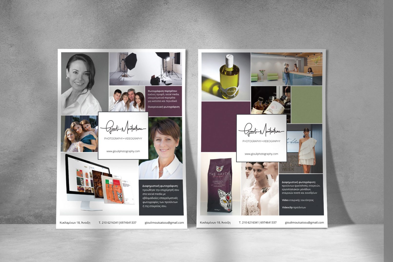 Giouli Moutsatsou is a professional freelance photographer, with extensive experience spanning across advertising, industrial photography, portraits, as well as coverage of weddings and events. This A5, double-sided flyer was created for the photographer to promote her services during a photography exhibition.