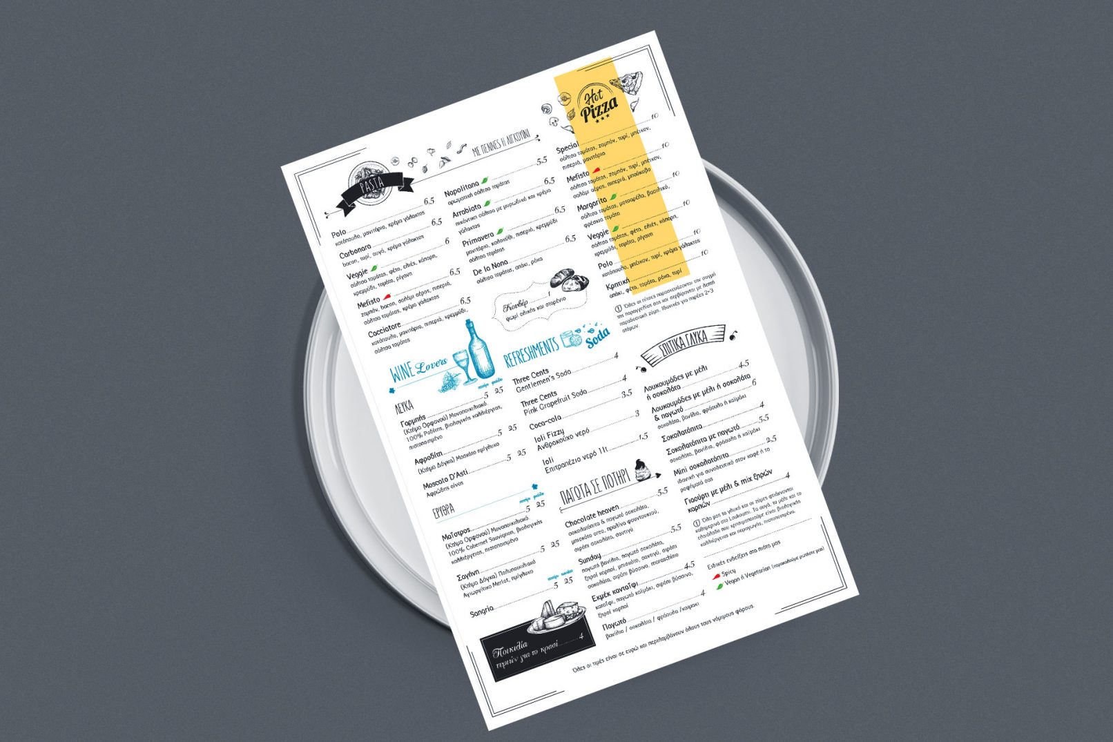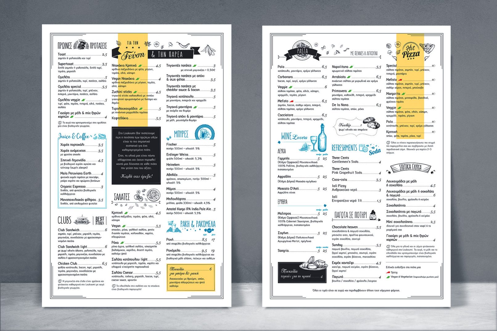 Loukoumi Bar is one of the oldest roof garden restaurants of Athens. It combines great local vibes together with a great range of food and drink options. In addition to being a bar and a restaurant it is also a reference point in the area and is very popular with the young crowd. Cultural activities such as concerts, exhibitions, performances, presentations are often held in its premises. This double sided menu presents the restaurant’s food and drink options, highlighting the quality of the fresh, home-made products.