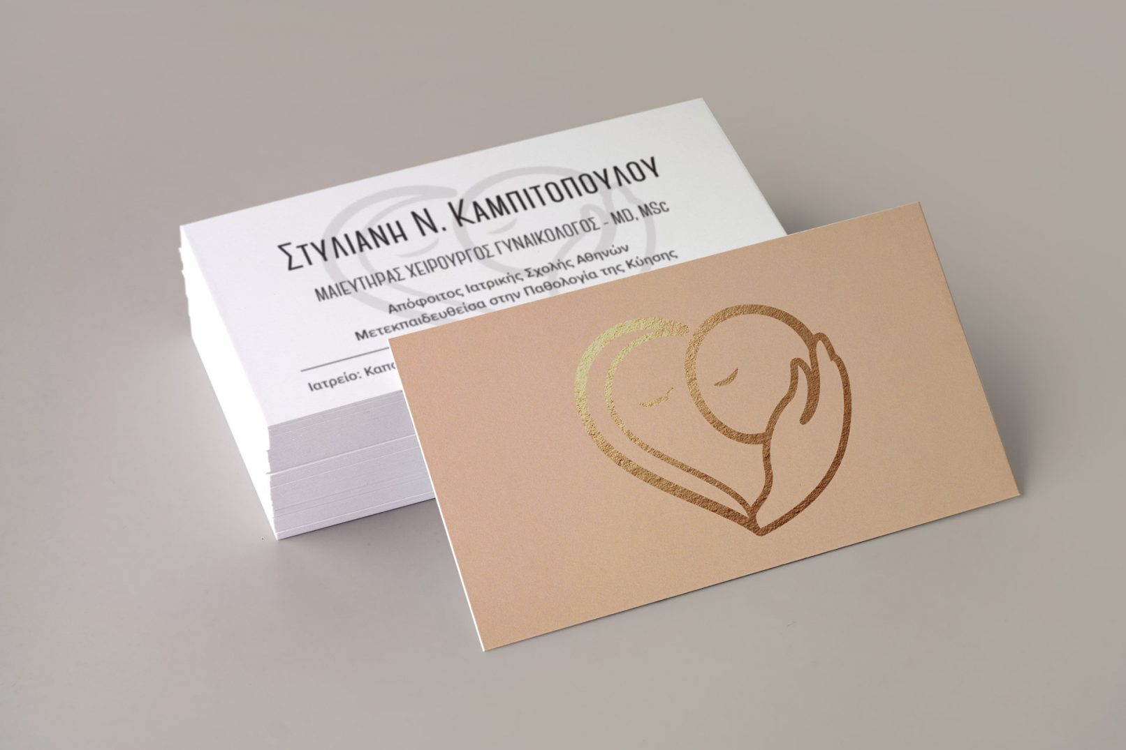 Logo and business card for the Ob-Gyn Stella Kambitopoulou. The card was printed and duplexed using Curious Touch Nude paper with gold foil printing on one side and velvet paper on the other.